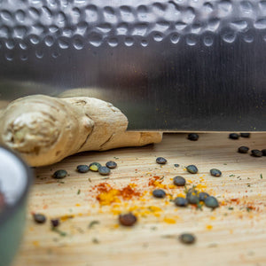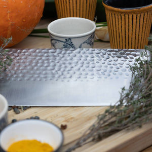 La lame plate et robuste est bien plus qu'un simple outil de coupe : elle sert également de broyeur à herbes et à noix et facilite le transfert des ingrédients. Le motif Tsuchime martelé à la main lui confère non seulement une esthétique traditionnelle, mais améliore aussi sa fonctionnalité en réduisant la friction lors de la coupe.