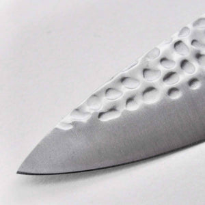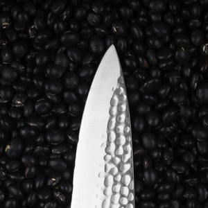 Le design hybride du Gyuto allie la finesse des lames japonaises à la robustesse de l'artisanat allemand. Son tranchant légèrement incurvé favorise un mouvement de balancier fluide, idéal pour hacher les herbes ou émincer l'ail, tandis que sa pointe abaissée améliore la précision des tâches minutieuses. Le martelage traditionnel Tsuchime (槌目) n'est pas seulement esthétique : il réduit la friction en créant des poches d'air, empêchant ainsi les aliments de coller à la lame.