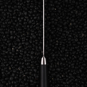 Grâce à sa soie pleine dissimulée , le Gyuto offre un équilibre exceptionnel, tandis que le manche ergonomique en bois de pakka noir assure une prise en main sûre et confortable pour une utilisation prolongée.